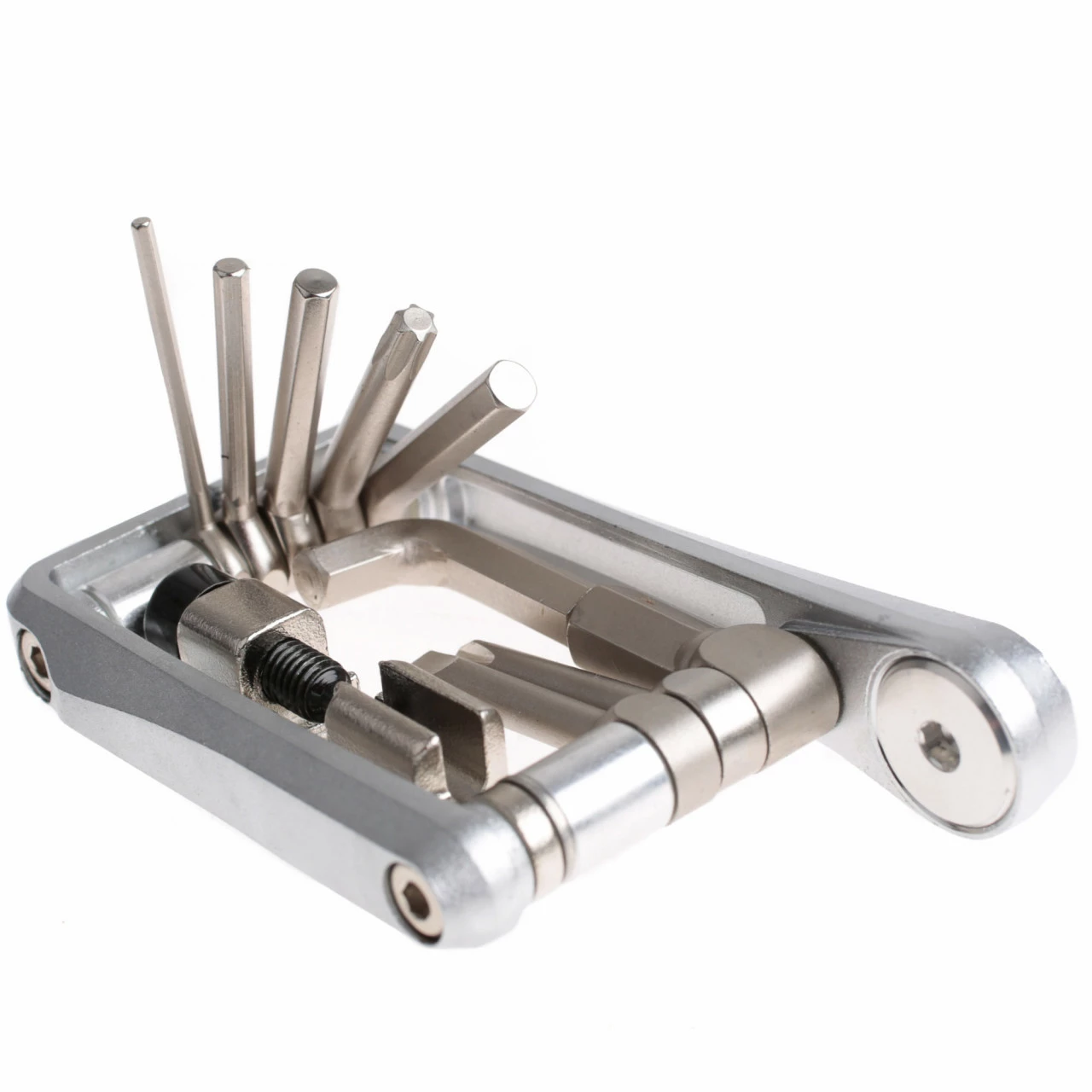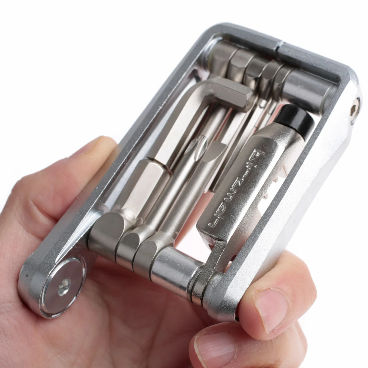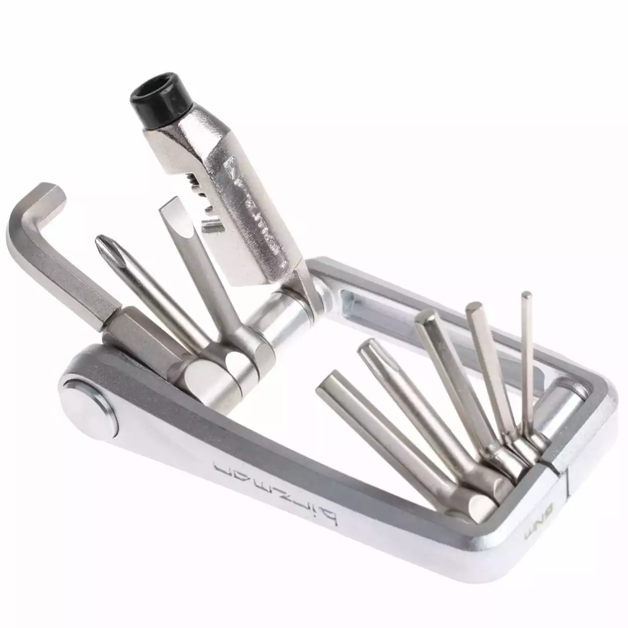 Dieses umfassende Werkzeug ist preisgekrönt und hochwertig. Das Anzugsmoment von 5 Nm wird durch ein Nachgeben des Knopfes signalisiert, wenn die 5 typischen Schlüssel genutzt werden, wie auf der Abbildung gezeigt. Der Kettennieter ist auf 12fach ausgelegt, also für die allerneuesten Schaltungen am Markt