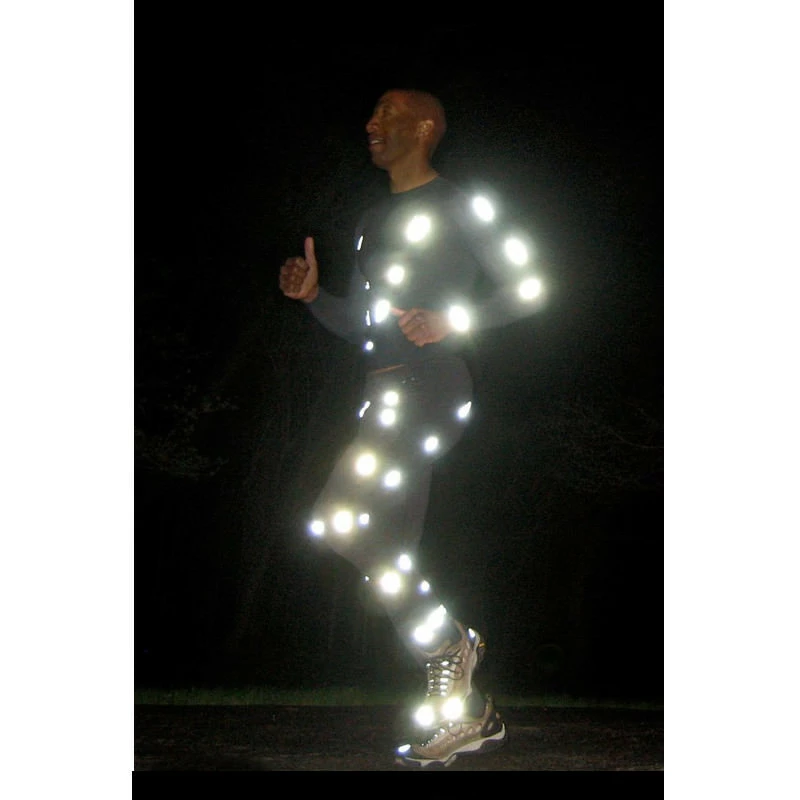 Diese kleinen stark reflektierenden Aufkleber lassen sich unauffällig anbringen und entfalten ihre Wirkung in der Dunkelheit. Bei dieser Menge von Reflektoren erstrahlt der Sportler förmlich.
