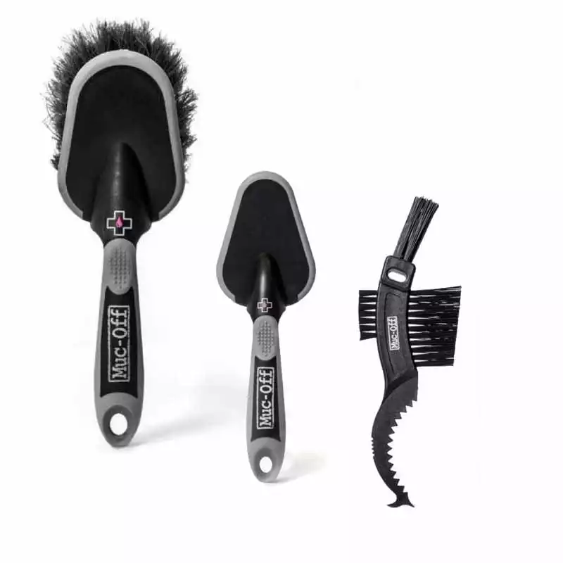 Die große Bürste hilft beim Reinigen des Rahmens, Lenker und Laufräder. Die kleine Bürste reinigt schwer erreichbare Stellen, wie z.B. Naben, Gabelkrone. Die Claw-Bürste reinigt die Kettenblätter, Kassette und Kette.
