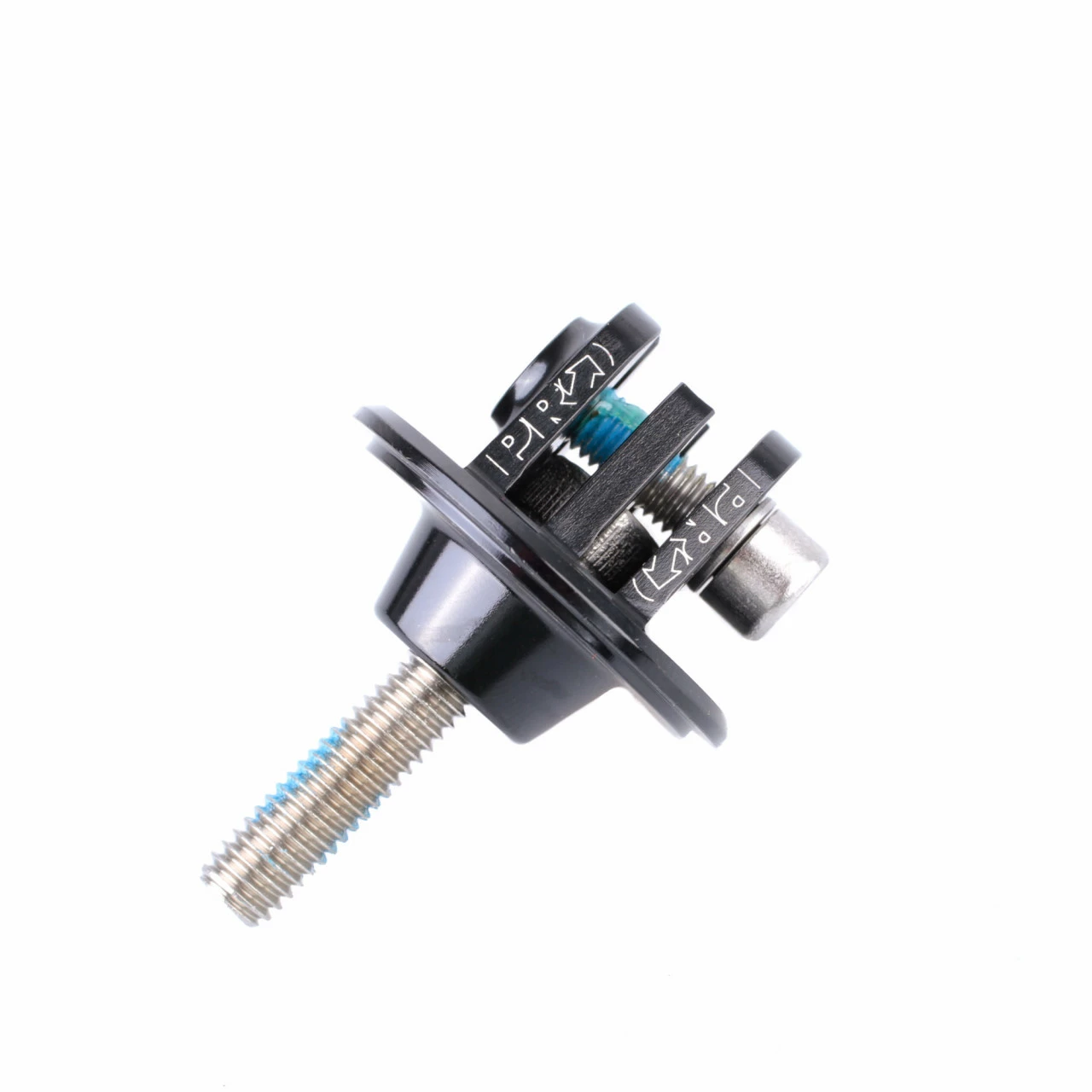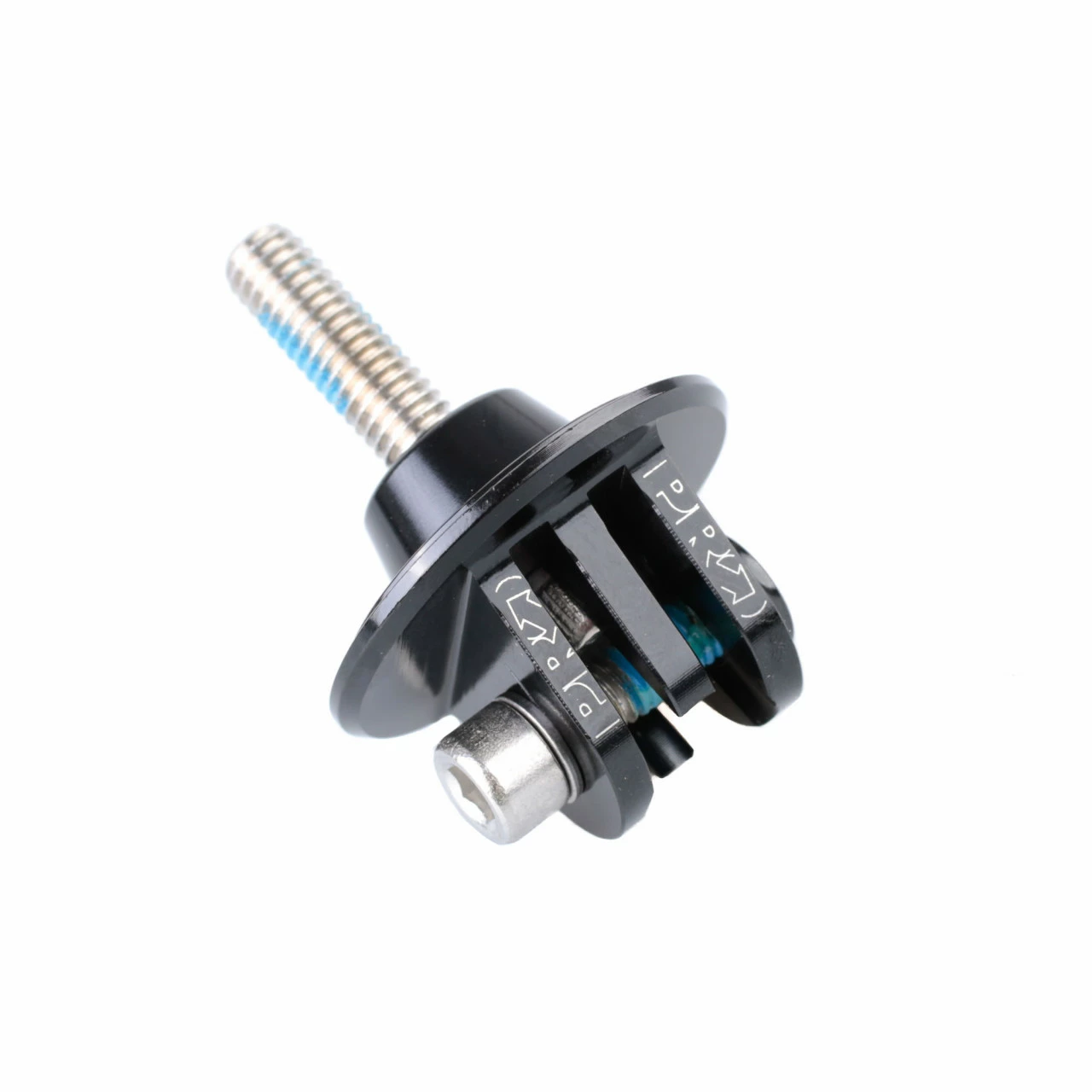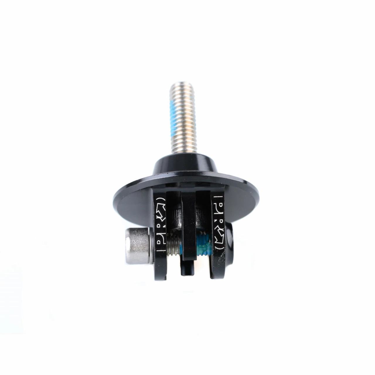 Die Halterung besteht aus hochwertigem, CNC-gefrästem Aluminium und wird mit einer Stahlschraube in den Steuersatz geschraubt.